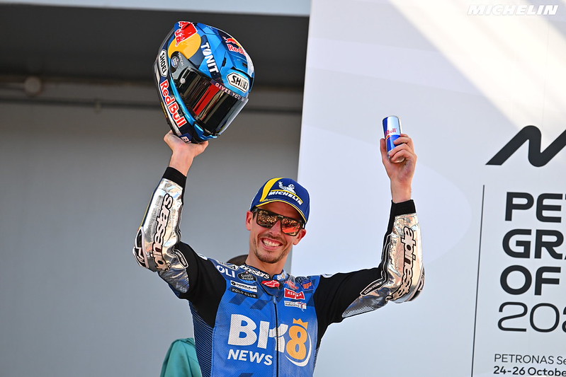 Nous retrouvons sur la plus haute marche du podium Alex Márquez, auteur d’une course incroyable sous les couleurs spéciales du BK8 Gresini Racing MotoGP — félicitations.