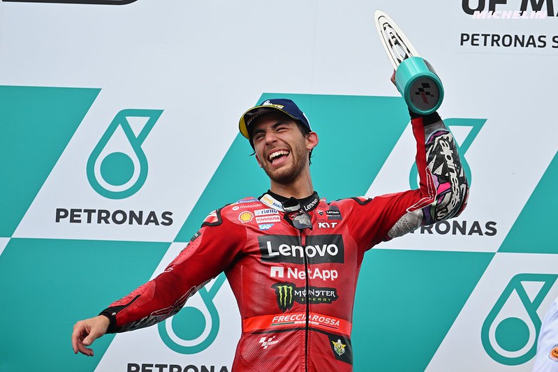 Mesdames et Messieurs, bienvenue sur le circuit international de Sepang en Malaisie à la fin du Grand Prix Petronas de Malaisie, la 18ème manche sur 20 du Championnat du Monde MotoGP de cette année. Félicitations à nos trois premiers pilotes, un podium entièrement Ducati, comme ce fut le cas dans le Sprint d’hier. Sa première victoire pour l’équipe Ducati Lenovo, félicitations à l’Italien Enea Bastianini ! Un grand week-end pour le pilote Gresini Racing Alex Marquez, Alex le vainqueur du Sprint d’hier et 2ème dans ce Grand Prix de 20 tours. Et complétant le podium d’aujourd’hui, il garde 14 points d’avance au championnat du monde avec seulement deux courses restantes, c’est le pilote de l’équipe Ducati Lenovo Pecco Bagnaia. Félicitations à tous les trois, messieurs !