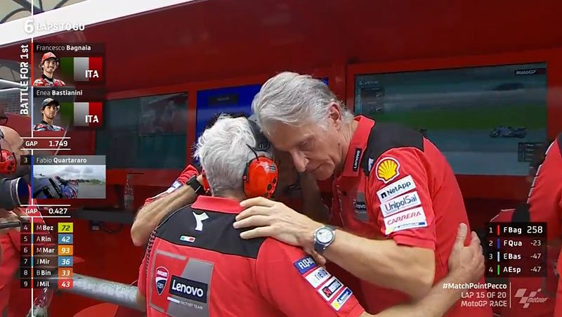 « Oui, j’ai vu le panneau, avec la position et le nombre de tours restants, si je ne chutais pas (rires) ! J’ai essayé de faire le maximum, et quand j’ai vu cela je savais que je devais faire attention car, je le répète encore, le titre est important pour Ducati. Mais aujourd’hui, j’ai essayé de gagner ! »