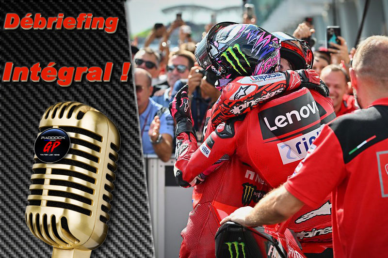 Mesdames et Messieurs, bienvenue sur le circuit international de Sepang en Malaisie à la fin du Grand Prix Petronas de Malaisie, la 18ème manche sur 20 du Championnat du Monde MotoGP de cette année. Félicitations à nos trois premiers pilotes, un podium entièrement Ducati, comme ce fut le cas dans le Sprint d’hier. Sa première victoire pour l’équipe Ducati Lenovo, félicitations à l’Italien Enea Bastianini ! Un grand week-end pour le pilote Gresini Racing Alex Marquez, Alex le vainqueur du Sprint d’hier et 2ème dans ce Grand Prix de 20 tours. Et complétant le podium d’aujourd’hui, il garde 14 points d’avance au championnat du monde avec seulement deux courses restantes, c’est le pilote de l’équipe Ducati Lenovo Pecco Bagnaia. Félicitations à tous les trois, messieurs !