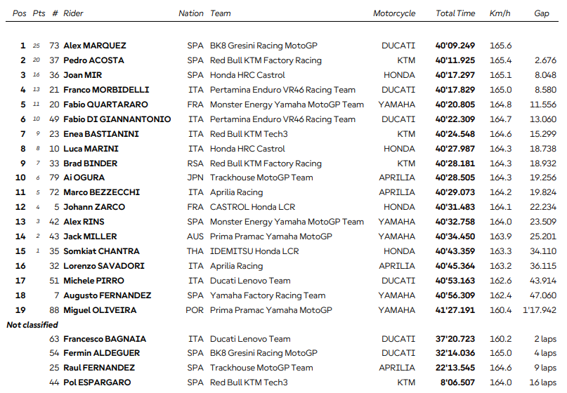 Après s’être qualifié au quatrième rang et avoir terminé la course sprint d’hier en cinquième position, le Français a de nouveau réalisé une course solide ce dimanche. Auteur d’un bon départ, il a maintenu sa quatrième place et l’a même défendue durant la première partie de la course face à un Joan Mir incisif. L’Espagnol a finalement eu le dernier mot, avant que Franco Morbidelli n’en profite également.