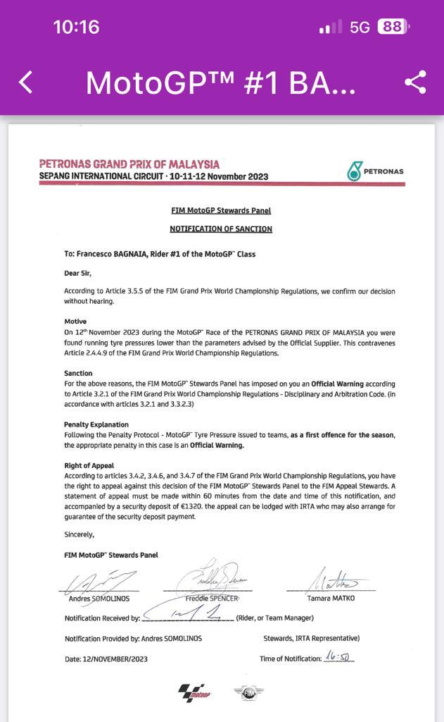 Le pilote Pramac avait ainsi intégré un club composé de Maverick Vinales, Marco Bezzecchi, Raul Fernandez, Marc Márquez, Franco Morbidelli et Pol Espargaro, et en quelque sorte présidé par Aleix Espargaro, premier pilote de l’histoire, et à ce jour le seul, à s’être fait prendre deux fois et donc à avoir reçu une pénalité de trois secondes après le Grand Prix, lui coûtant ainsi sur le tapis vert un podium acquis sur l’asphalte.