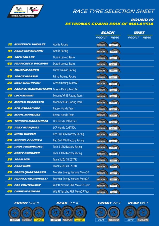 A l’issue de la course, Piero Taramasso, Manager Deux-roues de Michelin Motorsport, a déclaré : « Les conditions étaient typiques de Sepang ce weekend, avec des matins sur le sec et la pluie les après-midis. Cela a permis aux pilotes de passer en revue toute notre allocation de pneumatiques. Mais même sur le sec, les conditions n’étaient pas très bonnes vendredi matin avec une piste encore « verte », ce qui rend difficile le travail des pilotes. Malgré ces difficultés, Jorge Martin a battu le record du tour de plus d’une demi-seconde, ce qui prouve bien le potentiel de nos pneumatiques. »