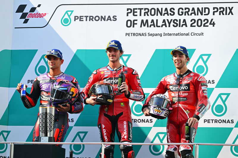 • Francesco Bagnaia (Ducati Lenovo Team) s’impose sur le circuit de Sepang, au gré d’une combinaison pneumatique parfaite pour affronter les éléments météo du sud-est asiatique.