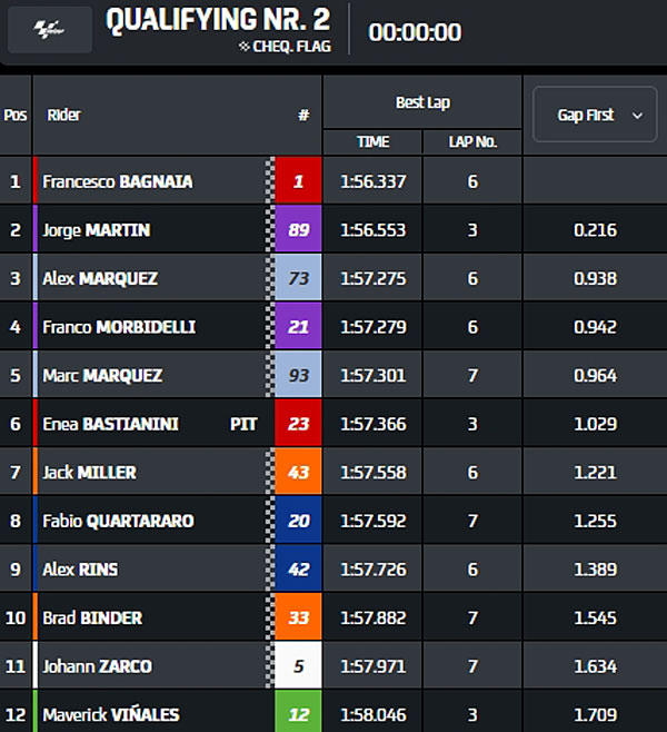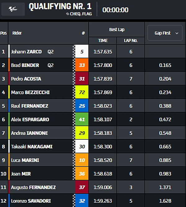 Dans une séance où l’on n’avait pas vu les Yamaha en aussi bonne forme depuis longtemps, Francesco Bagnaia, Jorge Martin, Enea Bastianini, Maverick Vinales, Alex Márquez, Fabio Quartararo, Franco Morbidelli, Alex Rins, Jack Miller et Marc Márquez ont gagné leur accès direct à la Q2 lors de la Practice, laissant ainsi Pedro Acosta, Marco Bezzecchi, Johann Zarco et Brad Binder s’expliquer entre eux pour tenter de se repêcher lors de la Q1.