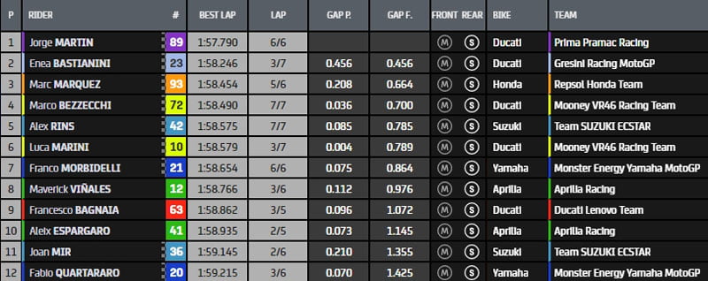 Au final, Jorge Martin a remporté la séance déterminante pour l’entrée en Q2 en arrêtant le chrono en 1’58.583 devant Marco Bezzecchi (Mooney VR46) pour 0.189s et Maverick Viñales pour 0.213s. Le deuxième pilote de l’équipe Mooney VR46, Luca Marini, a clôturé avec le quatrième meilleur temps devant Joan Mir et Enea Bastianini. Septième temps pour Fabio Quartararo qui devance Alex Rins et Aleix Espargaró. Franco Morbidelli complète le top dix. Cependant, le pilote italo-brésilien a été le protagoniste à deux reprises d’une conduite ambiguë en ralentissant la trajectoire et en gênant d’abord Quartararo puis Bagnaia, ruinant le tour de plusieurs pilotes dont Marc Marquez. Il a ensuite été pénalisé d’une pénalité de double long lap pour la course.