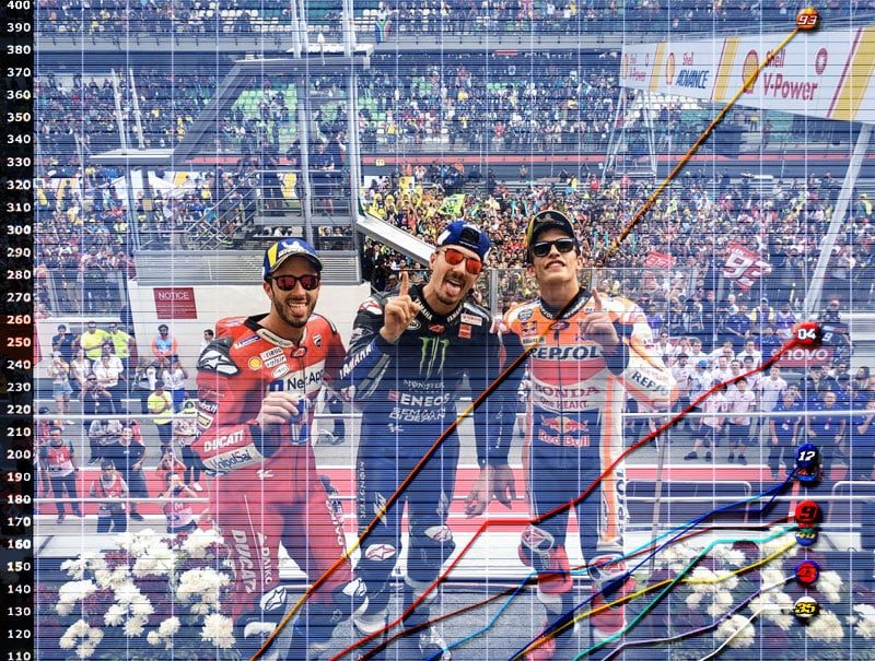 Le second est un Marc Márquez qui s’est élancé onzième avec un corps endolori par une lourde chute la veille. Mais il en faut plus pour arrêter l’officiel Honda habité par le bonheur d’avoir vu son frère sacré en Moto2 quelques minutes auparavant. Avec sa performance, il apparaît aux yeux de l‘histoire à présent comme le seul pilote ayant conquis 17 podiums en une saison et aussi le seul à avoir marqué 395 points. Jamais un pilote n’avait autant récolté, le précédent record était 383 points avec Lorenzo en 2010.