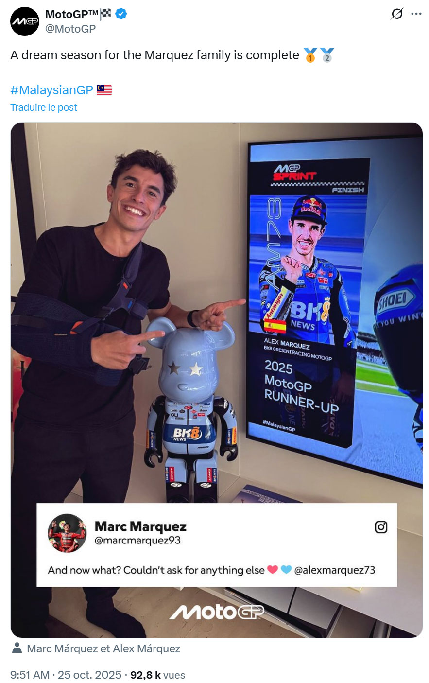 Le double Champion du Monde MotoGP a effectivement fait paraître facile le fait de battre Alex Marquez (BK8 Gresini Racing MotoGP) avec 2,2 secondes d’avance. Ce résultat a officiellement offert au #73 la deuxième place au championnat, créant un doublé fraternel Marquez 1-2 exceptionnel, célébré comme il se doit par son frère blessé !