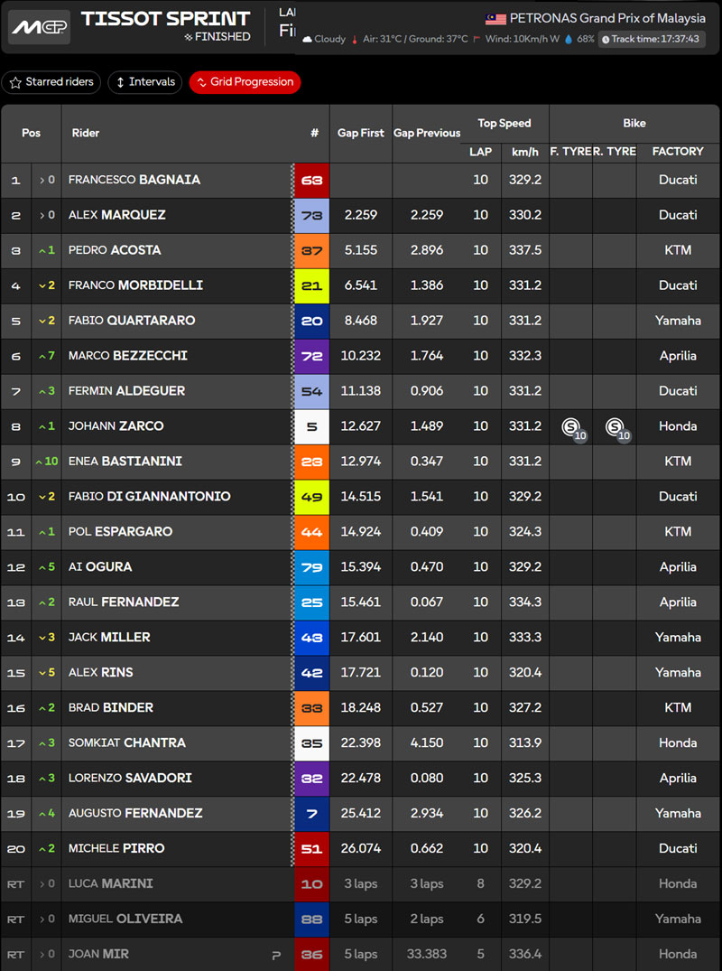 En demi-teinte, Johann Zarco (CASTROL Honda LCR), 8e, a confié avoir la confiance mais pas le rythme, et au final le dernier point revient à Enea Bastianini (Red Bull KTM Tech3), auteur de la plus belle remontée, avec 10 places gagnées.