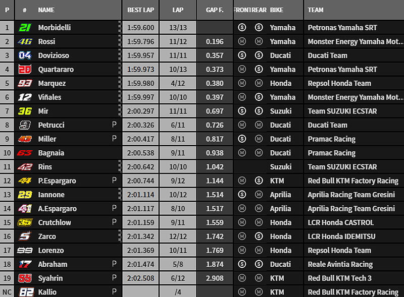Au terme d’une première journée écrasée par un Fabio Quartararo pourtant toujours visiblement handicapé suite à sa chute en Australie, le pilote français précédait Franco Morbidelli, Andrea Dovizioso, Maverick Viñales, Valentino Rossi, Marc Márquez, Alex Rins, Jack Miller, Aleix Espargaró et Cal Crutchlow dans la liste provisoire des pilotes pré-qualifiés pour la Q2.