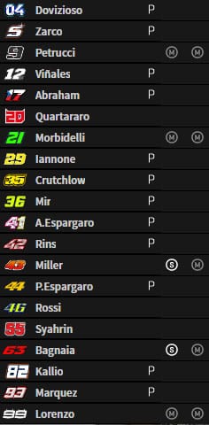 Les 10 heureux élus se nomment donc Fabio Quartararo, Franco Morbidelli, Marc Márquez, Maverick Viñales, Andrea Dovizioso, Jack Miller, Francesco Bagnaia, Valentino Rossi, Álex Rins et Johann Zarco.