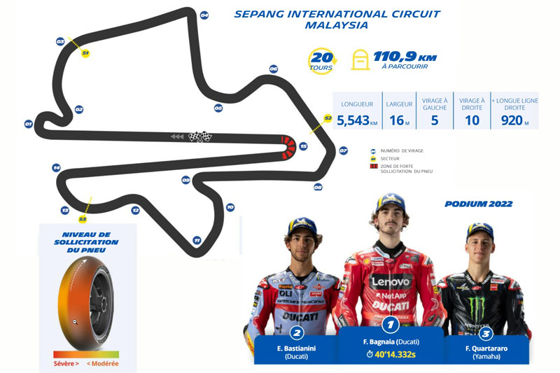 Le circuit de Sepang a été dessiné par l’architecte allemand Hermann Tilke à la fin des années 90. Long de 5,543 km, il est composé de cinq virages à gauche et dix à droite. Il comporte deux lignes droites, dont l’une dépasse 900 mètres de longueur. Comme souvent en Asie, la chaleur et l’humidité seront des critères-clés dans le déroulement du week-end de course. En outre, si l’asphalte a récemment été revu entre les virages 7 et 12, le niveau d’abrasivité devrait rester élevé sur l’ensemble du tracé. Cette surface abrasive, associée à une température au sol pouvant dépasser 50°C, constitue un défi pour les hommes, leurs machines et bien sûr les pneumatiques. Une combinaison qui plait toutefois à Michelin Motorsport, puisque Sepang est devenu au fil du temps une base d’essais récurrente. A chaque inter-saison, des tests MotoGP y sont menés afin de valider les améliorations apportées au cours des mois précédents, aussi bien sur les pneumatiques en eux-mêmes que sur leur capacité à accompagner les évolutions des motos.