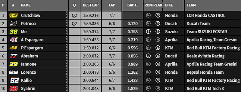 Dans le dernier tour, Joan Mir, Danilo Petrucci, Cal Crutchlow, Pol Espargaró et Aleix Espargaró produisent leur effort et c’est finalement Cal Crutchlow qui remporte in extremis la timbale en 1’59.216 devant Danilo Petrucci.