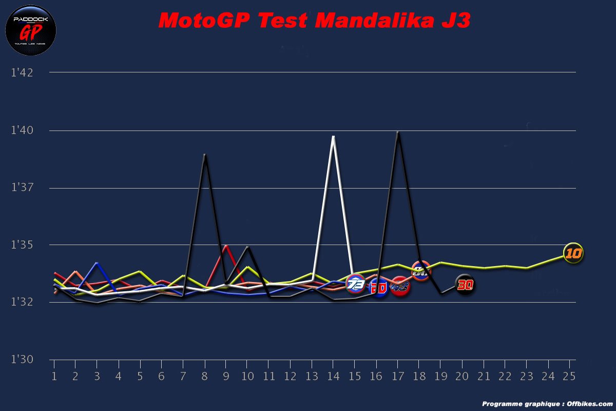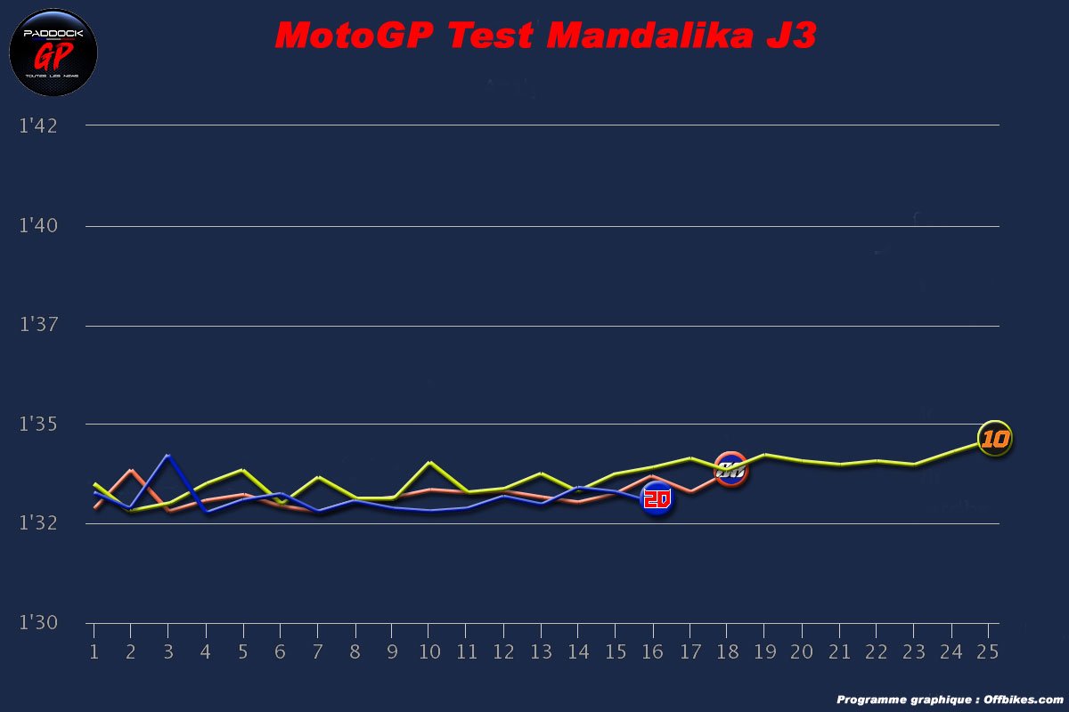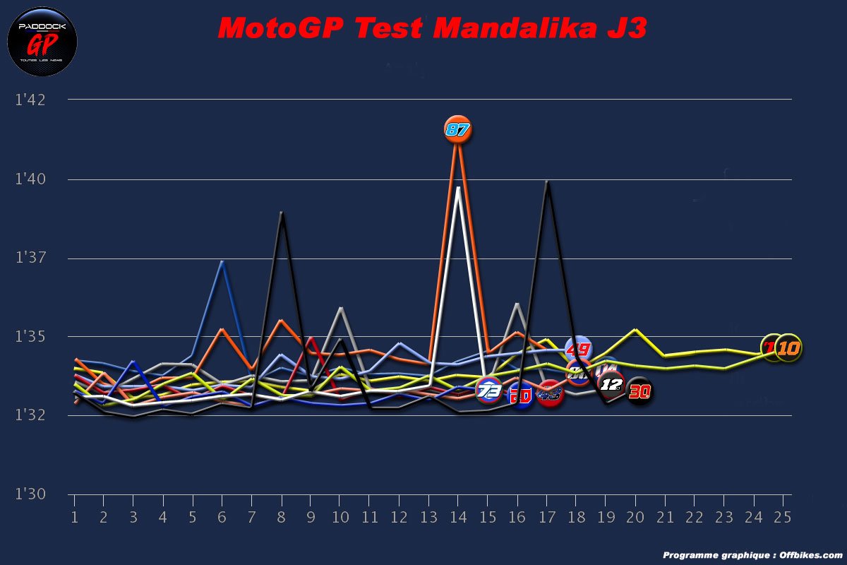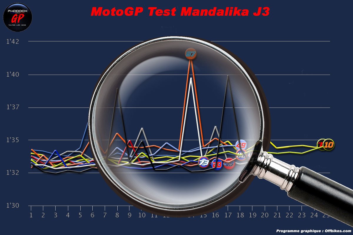 Globalement, seuls treize pilotes ont fait une simulation de course de plus de 10 tours le dernier jour des tests à Mandalika : Fabio Quartararo, Francesco Bagnaia, Maverick Viñales, Álex Márquez, Miguel Oliveira, Luca Marini, Takaaki Nakagami, Jack Miller, Andrea Dovizioso, Marco Bezzecchi, Fabio Di Giannantonio, Remy Gardner et Darryn Binder.