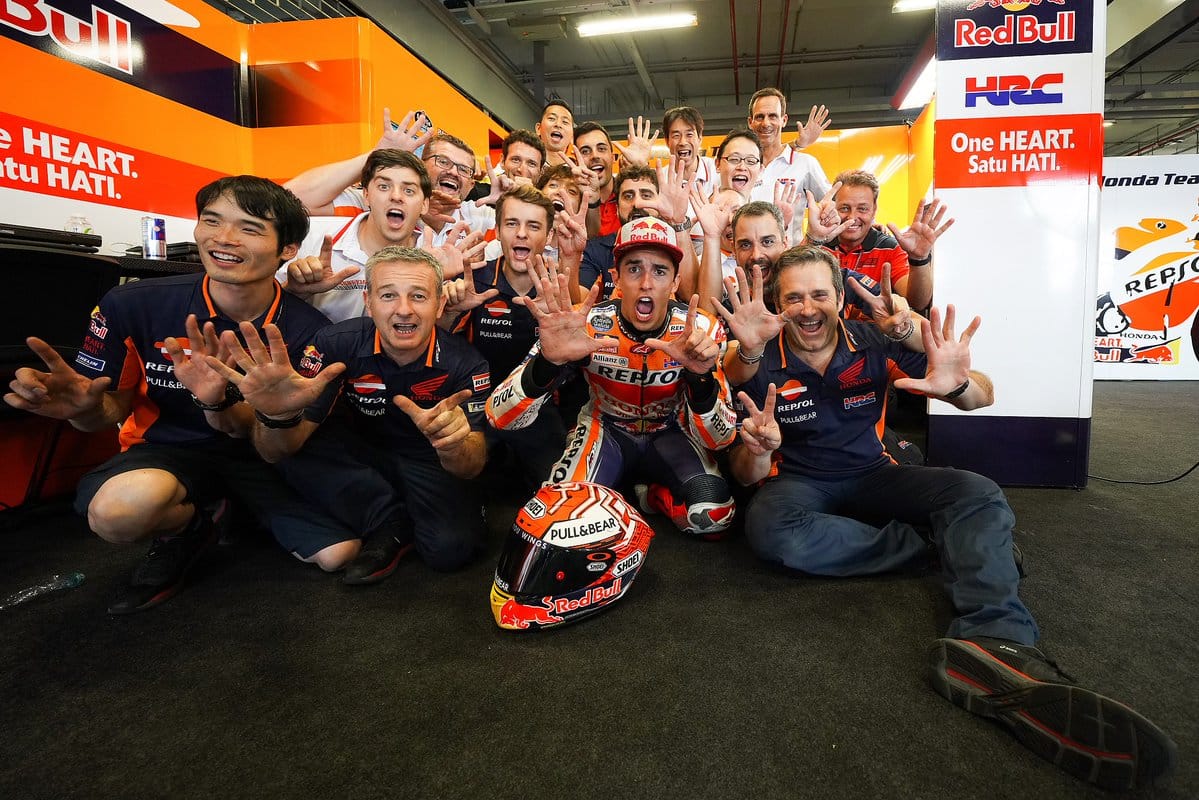 A l’arrivée du Grand Prix de Thaïlande, premier de l’histoire du MotoGP, Marc Marquez matérialisait avec les doigts de ses deux mains un chiffre 7 qui faisait le bilan de ses victoires à ce stade de la saison. Mais lors du prochain rendez-vous, qui aura lieu au Motegi, pour un Grand Prix du Japon cher à son employeur Honda, le même Marquez pourrait très bien réitérer la scène. Mais pour mieux rappeler le nombre de ses titres conquis dans sa carrière…