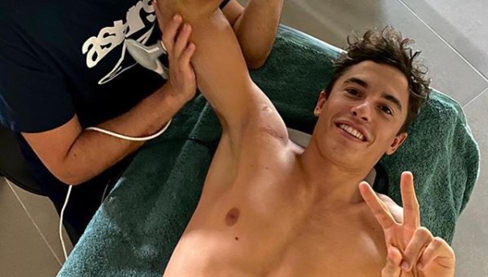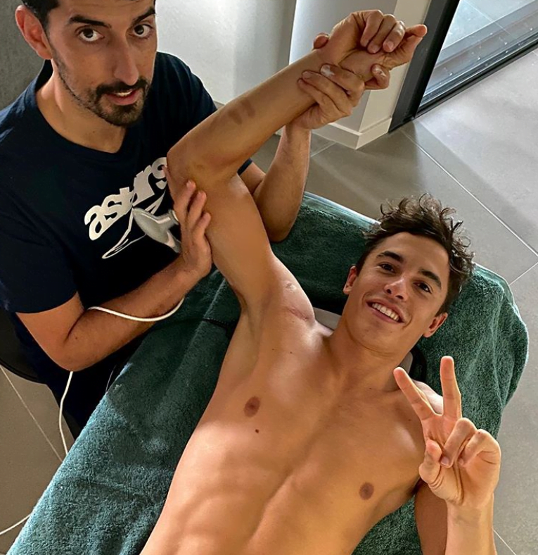 Sur cette image, Marc apparaît souriant, faisant un geste de victoire avec ses doigts pendant que Carlos effectuait l’un des exercices que Márquez doit faire pendant ces jours pour se remettre de sa récente opération sur l’humérus de son bras droit.