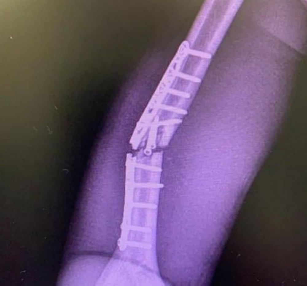 « Cette photo en dit long. Si la nouvelle opération avait été normale, ce plâtre ne devait pas atteindre l’index de la main droite. Il est possible qu’il y ait eu une deuxième intervention avec un clou le long de l’axe de l’humérus qui a dû être inséré à partir du coude. Le coude doit être complètement immobilisé. Mais j’ai une autre hypothèse plus risquée : la deuxième intervention ne s’est pas déroulée comme souhaitée ».