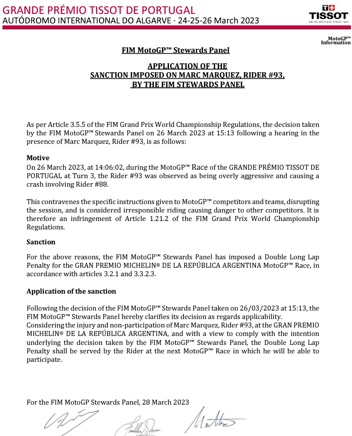 Conformément à l’Article 3.5.5 du Règlement du Championnat du Monde des Grands Prix FIM, la décision prise par le Panel des Commissaires Sportifs FIM MotoGP™ le 26 mars 2023 à 15:13 à la suite d’une audition en présence de Marc Marquez, Pilote #93, est la suivante :