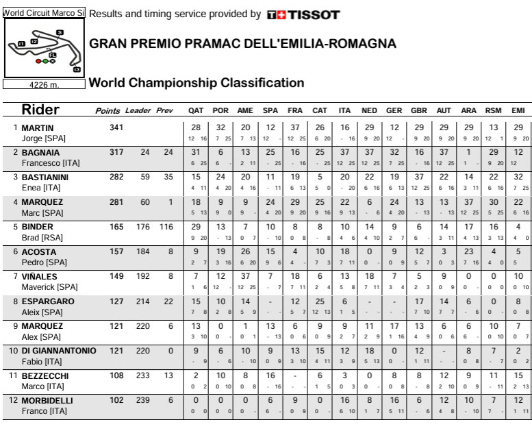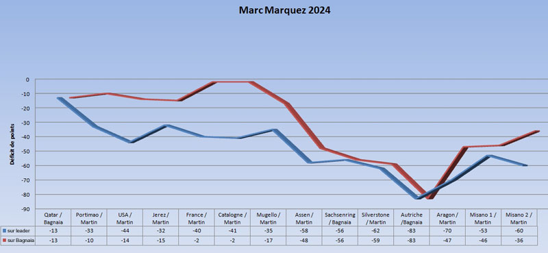 Le prix sera celui de l’excès de confiance (ou de motivation) et de l’impuissance alors que les GP 24 commencent, elles, justement à monter en puissance : le pilote s’adapte globalement encore mieux à sa machine, mais les GP 24 deviennent quasi imbattables et empêchent collectivement Marc Marquez de marquer de très gros points. A l’issue de l’Autriche, le déficit se creuse et il concède 83 points à Francesco Bagnaia, 78 à Jorge Martin et même 22 à Enea Bastianini. Ce point bas de la saison conclut une deuxième phase que l’on peut qualifier de plutôt négative (façon de parler, bien entendu).