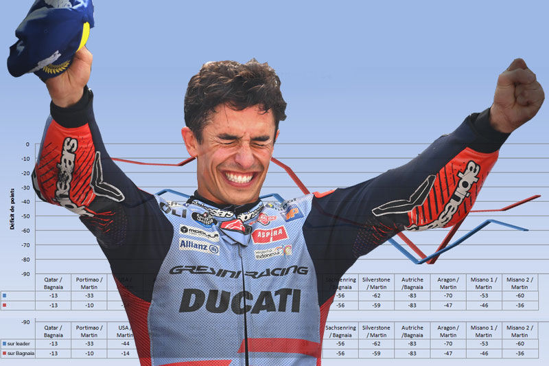 Aragon, et ses 37 points qui permettent alors à Marc Marquez de rejoindre le club très fermé des « double vainqueur d’un week-end » constitué de Maverick Vinales, Jorge Martin, Francesco Bagnaia et Enea Bastianini, marque le début de la troisième période, celle de la remontée. Car malgré un niveau général qui ne cesse de s’élever grâce à des GP 24 maintenant complètement au point, Marc Marquez ne commet plus de faute et grapille même des points avec sa GP 23. Il est dorénavant à 60 points du leader Jorge Martin et à 36 de Francesco Bagnaia.