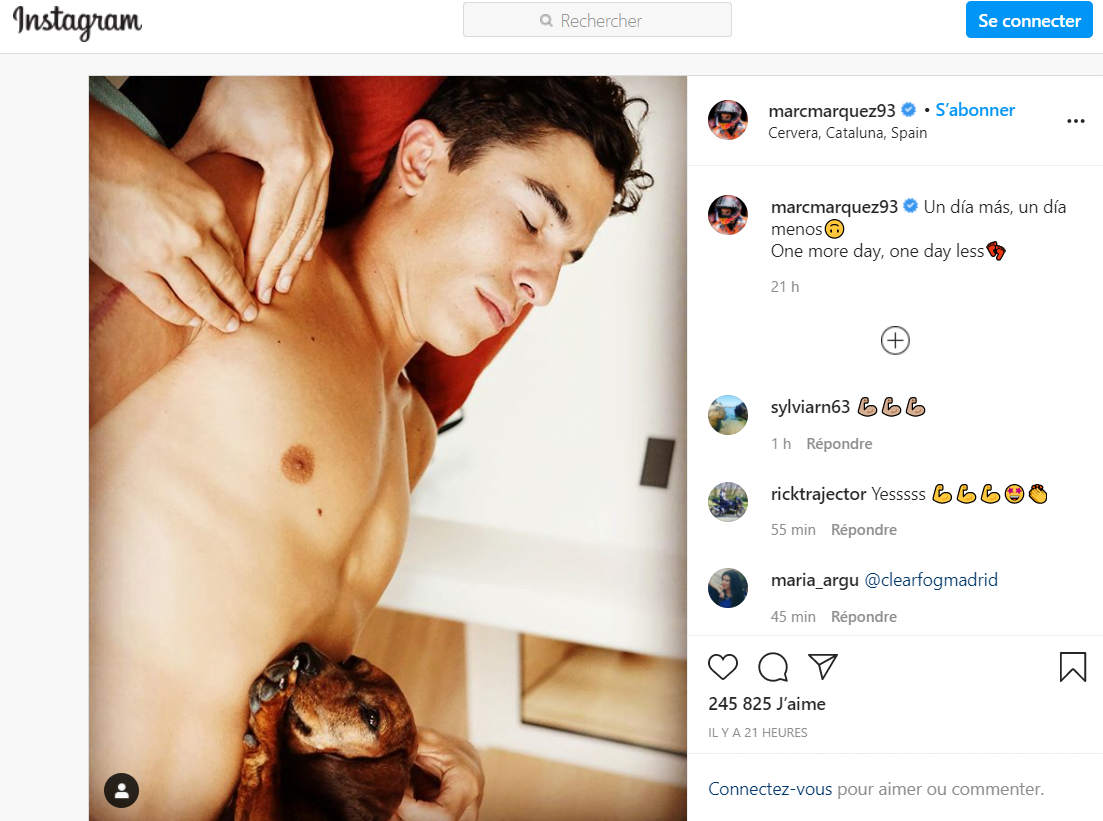 Marc Marquez ne piaffe pas encore d’impatience, puisque l’expérience qu’il vit l’a convaincu de ne plus jamais précipiter les choses en cas de blessure, mais tout de même, il ronge son frein. L’octuple Champion du Monde qui devra encore attendre pour être autant titré que Valentino Rossi a de nouveau fait acte de présence sur la toile pour montrer qu’il était bel et bien en pleine période non plus de simple convalescence, mais de remise au niveau pour remonter sur la Honda…