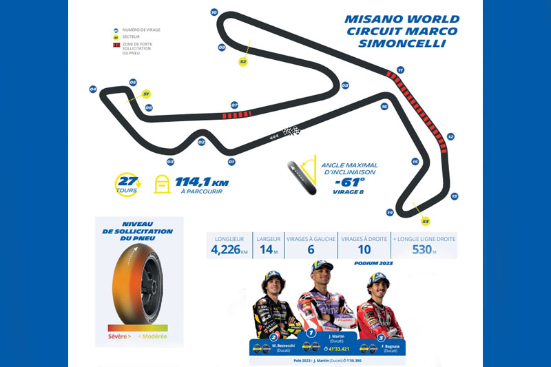 Le Circuit de Misano, sorti de terre en 1969, accueille des courses de motos depuis 1972, soit 52 ans. Un passé très riche rythmé de quelques pauses, notamment lorsque qu’a été entamé, à partir de 1993, un programme de modernisation. De son côté, le MotoGP organise à Misano un Grand Prix chaque année depuis 2007, date à partir de laquelle le sens du circuit a été inversé (les concurrents l’empruntent désormais dans le sens des aiguilles d’une montre). Le « Misano World Circuit Marco Simoncelli » est aussi le théâtre d’un grand nombre d’essais privés, ce qui explique que Michelin et ses partenaires en connaissent bien le tracé.