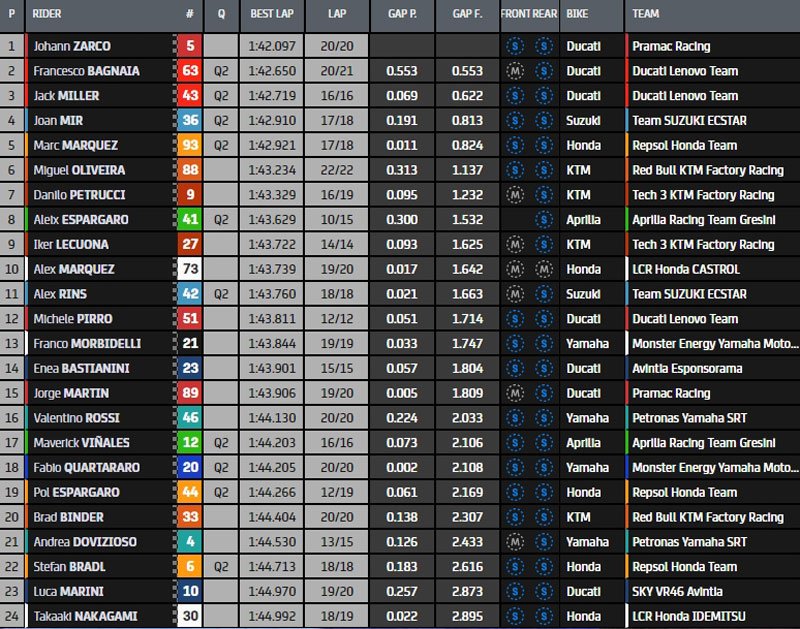 À la mi-séance, on trouve donc trois Ducati en tête, emmenée par Johann Zarco, Jack Miller et Francesco Bagnaia, devant Marc Márquez, Miguel Oliveira, Aleix Espargaro, Pol Espargaro, Iker Lecuona, Alex Rins, Valentino Rossi, Alex Márquez, Jorge Martin, Joan Mir, Maverick Vinales, Franco Morbidelli, Fabio Quartararo, Danilo Petrucci, Andrea Dovizioso, Brad Binder, Michele Pirro, Takaaki Nakagami, Luca Marini, Stefan Bradl et Enea Bastianini.