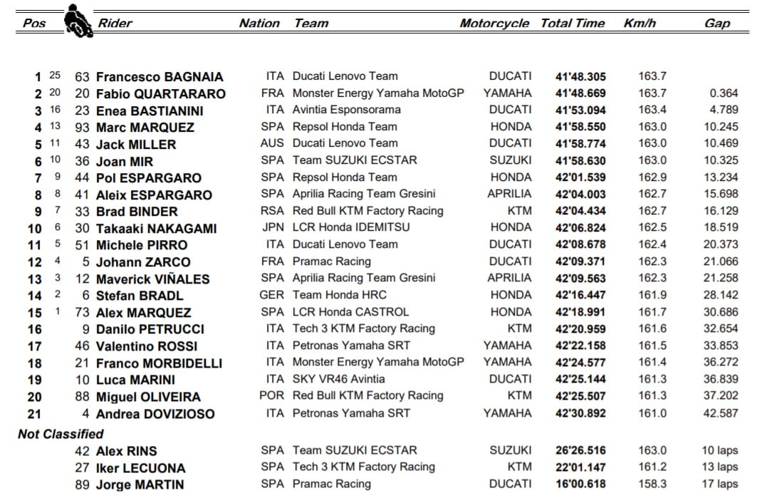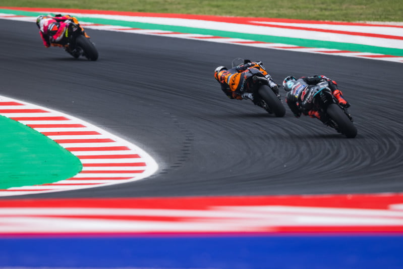« A partir de là, mon objectif était simplement de rallier l’arrivée. J’ai souffert de pas mal de wheelie dans les lignes droites, et la moto était vraiment mal équilibrée car j’avais plus d’appuis d’un côté que de l’autre, du fait justement de mon accrochage avec Lecuona qui avait endommagé la partie droite de mon aileron. Il m’était déjà arrivé de faire une course sans avoir d’aileron, c’était au Sachsenring en 2019, et je dois dire que si les ailerons sont là c’est qu’il y a une raison car en leur absence on est vraiment limités. »