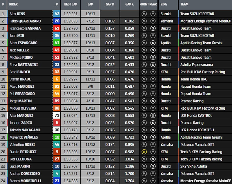Dans la foulée, Alex Rins s’empare de la deuxième position mais Fabio Quartararo enfonce le clou en 1’32.623.