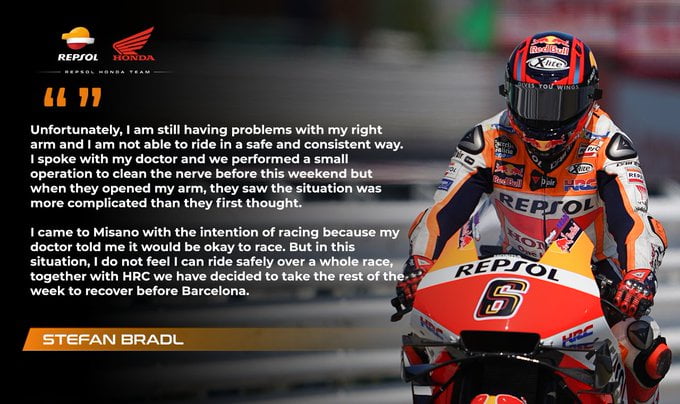 « Je suis venu à Misano avec l’intention de courir car mon docteur m’avait dit qu’il serait possible de faire la course. Mais dans cette situation, je ne me sens pas que je puisse piloter en sécurité durant la longueur d’une course entière, et conjointement avec HRC, nous avons décidé de prendre du repos cette semaine pour nous rétablir avant Barcelone. »