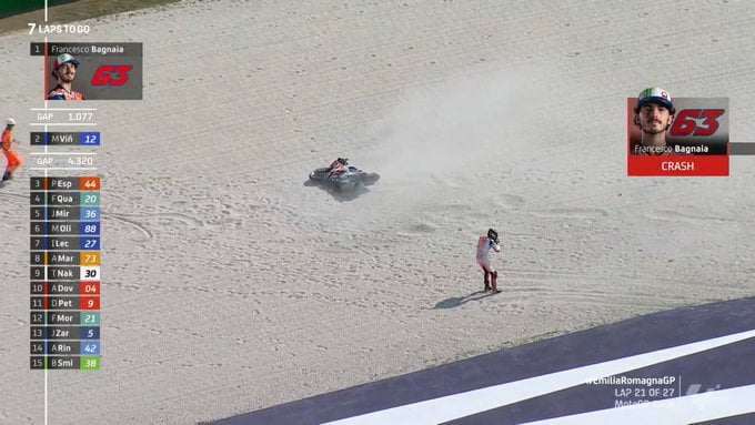 C’est le grand perdant de ce dimanche dévolu à un Grand Prix d’Emilie Romagne qui était le second meeting en autant de week-ends successifs à Misano. Pecco Bagnaia menait une course qu’il contrôlait après une bonne remontée. Et puis il est parti à la faute en chutant, alors que le samedi il avait dû abandonner sa pole-position pour avoir trop abusé d’une partie verte dont on a reparlé ensuite en course pour un Français… Mais ça ne l‘empêchera pas d’avoir bientôt une Ducati rouge…