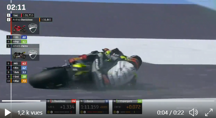 Les cinq dernières minutes sont entamées. Zarco, Miller et Rins ne peuvent en rester là … Le Français attaque améliore ses secteurs mais chute dans le tout dernier…