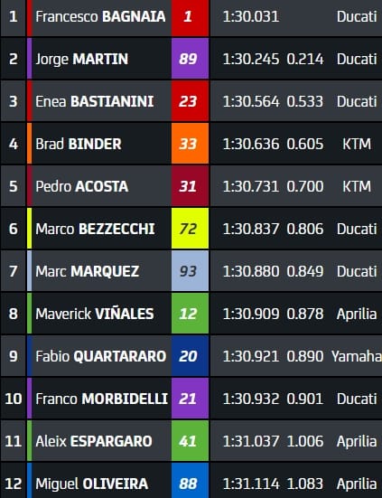 Le top5 de cette entame de séance : Martin en 1.30.245s (nouveau record), Bagnaia, Acosta, MMarquez et Bastianini. Quartarao 7e