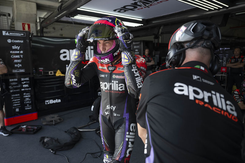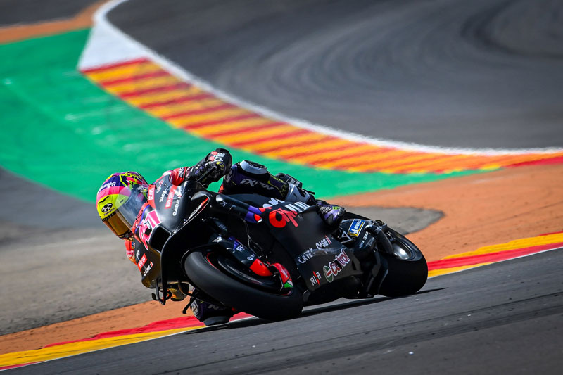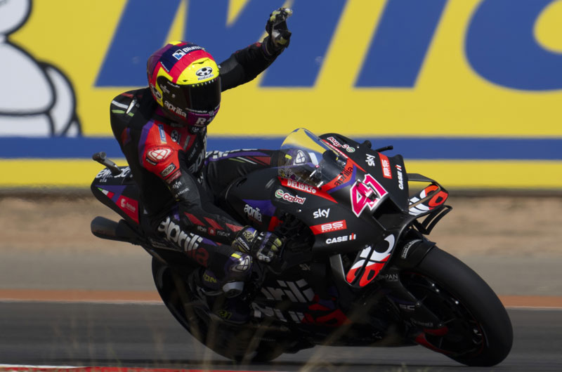 Sans égaler sa victoire en sprint et sa 4e place en GP à Barcelone, le numéro 41 n’avait pas manqué sa rentrée après la pause estivale, oubliant les déconvenues d’Assen (fracture à la main) et le forfait consécutif au Sachsenring en montant sur le podium du sprint en Grande-Bretagne et sur le Red Bull Ring. Sans même parler de sa 6e place à Silverstone, on pouvait croire la machine Aprilia relancée et l’optimisme était de sorti avant Aragon et son voyage en terre inconnue.
