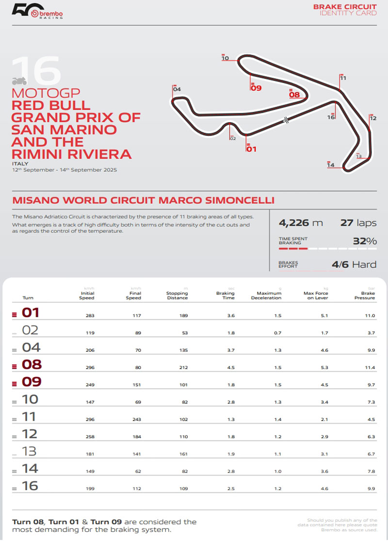Le virage le plus exigeant en termes de freinage à Misano est le virage 8 : les motos MotoGP décélèrent de 296 km/h à 80 km/h en 4,5 secondes sur une distance de 212 mètres, tandis que les pilotes exercent une pression de 5,3 kg sur le levier de frein.