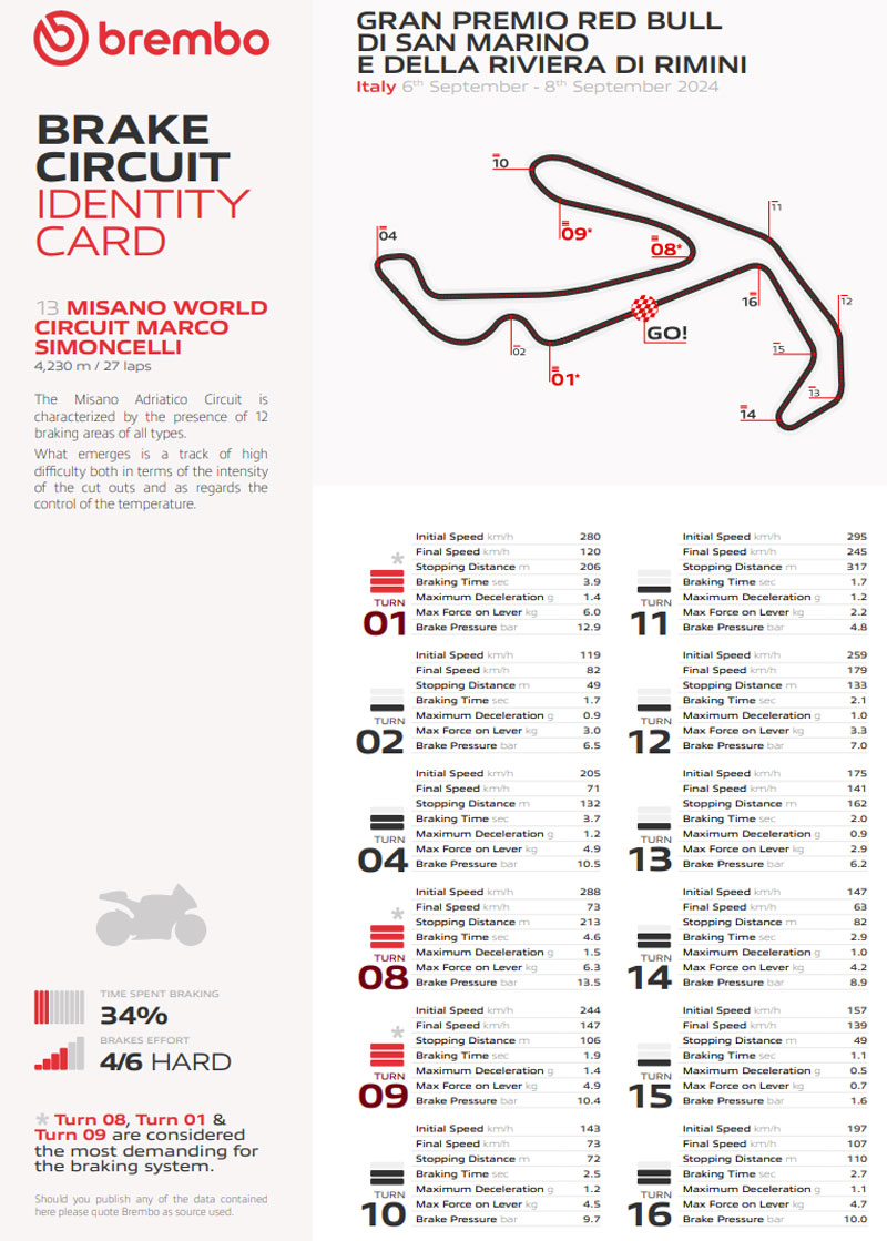 Selon les techniciens Brembo qui travaillent en étroite collaboration avec tous les pilotes de MotoGP, le Misano World Circuit Marco Simoncelli, long de 4,2 km, est considéré comme un circuit exigeant pour les freins. Sur une échelle de 1 à 6, il présente une difficulté de 4, avec 12 points de freinage par tour, y compris dans chaque virage de 8 à 16 : 3 sont classés comme durs et 4 comme moyens. Dans chaque tour, les freins sont utilisés pendant 31 secondes et nécessitent une charge totale sur le levier de frein de plus de 47,5 kg.