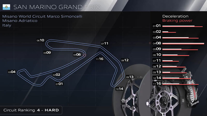 Le virage le plus exigeant en termes de freinage à Misano est le virage 8 : les motos MotoGP décélèrent de 296 km/h à 80 km/h en 4,5 secondes sur une distance de 212 mètres, tandis que les pilotes exercent une pression de 5,3 kg sur le levier de frein.