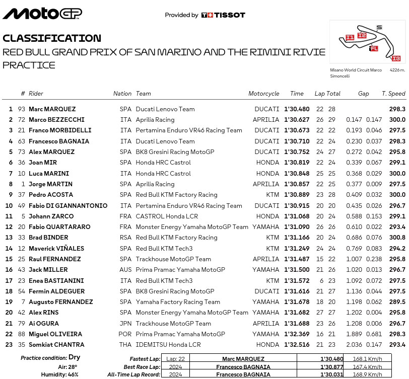 Avec un temps de 1’30.480, Marc Marquez (Ducati Lenovo Team) a remporté la première journée du Grand Prix Red Bull de Saint-Marin et de la Riviera de Rimini, lors d’un après-midi très disputé dans la course hebdomadaire du MotoGP pour le top 10 du vendredi.