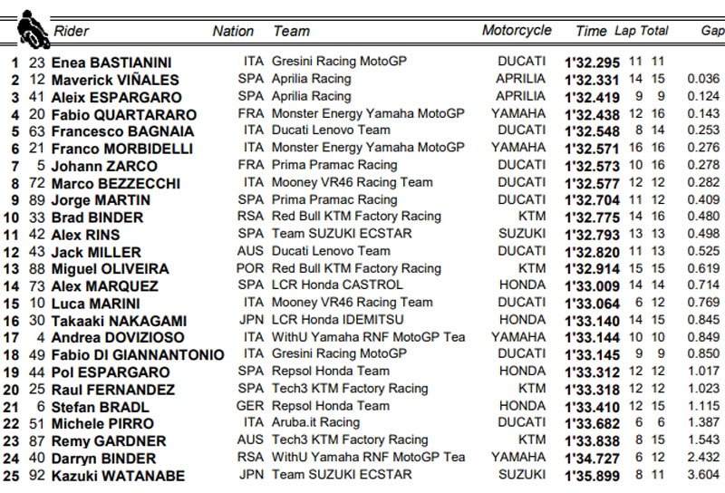 Sous le drapeau à damier, c’est Bastianni qui rafle la mise en 1’32.295. Viñales suit. Quartararo est quatrième malgré le fait d’avoir été gêné par Remy Gardner. Zarco est septième.