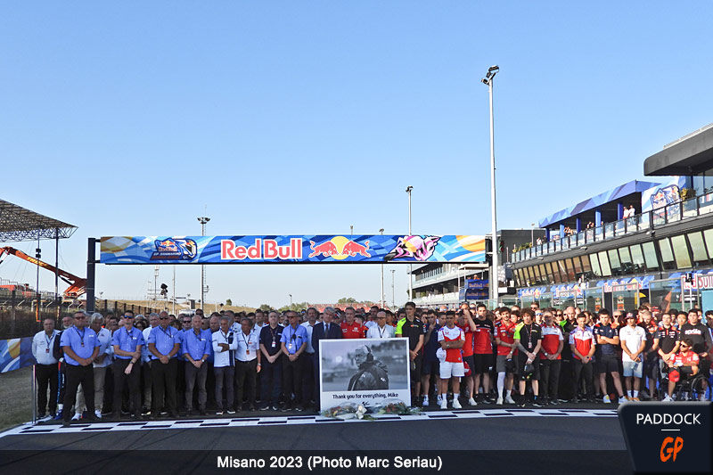 A 18 heures, la quasi totalité du paddock des Grands Prix s’est réunie sur la ligne droite du Misano World Circuit pour rendre hommage à Mike Trimby lors d’une cérémonie extrêmement émouvante, mêlant la jeune génération à ceux qui l’appréciaient depuis plus de quatre décennies. La brutalité de sa disparition a véritablement choqué le microcosme du MotoGP et l’entièreté de ses membres, du plus humble au plus élevé.