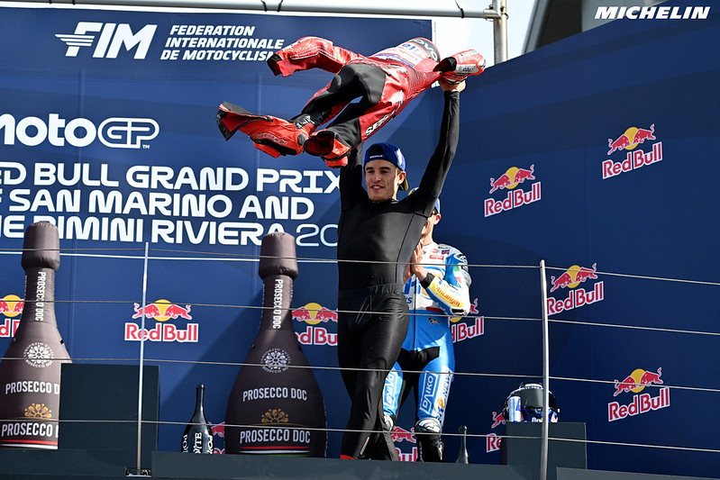 Marc Márquez : « Oui, la meilleure façon d’oublier le sprint d’hier, ou l’erreur d’un pilote, est simplement d’essayer de revenir à piloter à nouveau la moto et de donner mon maximum. Et c’est ce que j’ai fait aujourd’hui dès le warm-up. J’ai eu cette concentration supplémentaire, cette énergie supplémentaire, mais honnêtement, dans les derniers tours j’ai dû me battre contre un Marco Bezzecchi très dur, qui poussait extrêmement fort. Je pense que nous deux, nous poussions plus que d’habitude, mais, vous savez, c’était son Grand Prix à domicile et il avait une motivation supplémentaire, et moi j’avais une motivation supplémentaire à cause de la chute d’hier. »