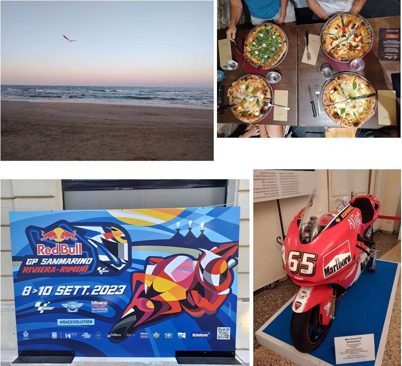 Changement de destination donc et direction la côte Adriatique ! Après un long voyage de 18h, nous arrivons à Rimini, station balnéaire réputée pour ses kilomètres de plage… et ses boites de nuits ! Après avoir profité du soleil, de la mer, de la gastronomie italienne et même visité une exposition du Motoclub Renzo Pasolini dédiée aux 50 dernières années du motocyclisme italien, notre week-end moto démarre et nous sommes loin de nous imaginer tout ce qui nous attend…
