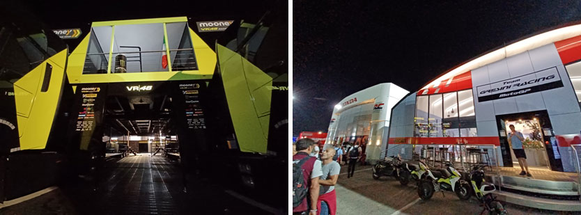 Le samedi, c’est aussi soir de fête dans le paddock. Il est interdit de filmer: ce qui se passe dans le paddock reste dans le paddock. Nous avons eu la surprise de voir Valentino Rossi mixer dans une hospitality pour notre plus grand plaisir et celles des personnes présentes. D’autres hospitalities en profitent pour monter le son de la sono et s’accordent quelques moments de relâchement avec des VIP invités pour l’occasion. Chez Pons, on fête le titre MotoE de Mattia Casadei. Chez Pramac, l’ambiance est sereine après la victoire en course sprint de Jorge Martin. L’ambiance est plus studieuse chez Honda, où Marc Marquez dine avec son équipe en analysant la course sprint. Chez Aprilia, Aleix Espargaro défie au babyfoot un membre de son équipe. Les futurs coéquipiers Alex Rins et Fabio Quartararo blaguent avec l’anglais Jake Dixon tandis que Johann Zarco salue une dernière fois son équipe avant d’enfourcher sa mini moto électrique pour rejoindre son hôtel à quelques kilomètres du circuit. Pedro Acosta sort lui aussi du circuit chercher du ravitaillement et ne passe pas inaperçu devant les fans qui attendent à l’entrée du paddock pour apercevoir les pilotes. Dans le box Ducati officiel, on travaille encore. Pecco Bagnaia va à la rencontre des quelques personnes qui attendent devant le camion Ducati. Il prend du temps, surtout avec les jeunes bambins italiens émerveillés de voir leur champion, dont la présence aurait pu être compromise après sa terrible chute survenue deux semaines plus tôt. On le sent fatigué, mais il fait attention à répondre à toutes les sollicitations. C’est ainsi que le paddock vit jusqu’à tard dans la soirée, vidé de ses invités et des journalistes, il retrouve une partie de son intimité.