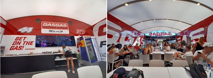 Après avoir découvert les différentes zones accessibles avec notre badge, nous nous dirigeons vers l’hospitality Tech3 où nous rejoignons Marc et Gilles de Paddock-GP. Dès notre arrivée nous sommes superbement accueillis par les membres de l’équipe Tech3 en charge de recevoir les invités, partenaires et pilotes de l’équipe. Ici, à n’importe quel moment de la journée il est possible de se désaltérer, de déjeuner ou de se rafraîchir grâce à la climatisation fortement appréciée avec ces fortes chaleurs. Nous profitons d’un bon repas (accompagné d’une boisson Red Bull bien sûr) pour faire connaissance avec nos co-hôtes et échanger sur les dernières actualités. Marc, qui vient tout juste de terminer une interview avec Paolo Ciabatti, a obtenu l’info qui va agiter la planète MotoGP dans les heures qui suivent : la marque italienne ne ferme pas la porte à une signature de Marc Marquez chez Gresini, car rien n’est impossible en MotoGP… affaire à suivre.
