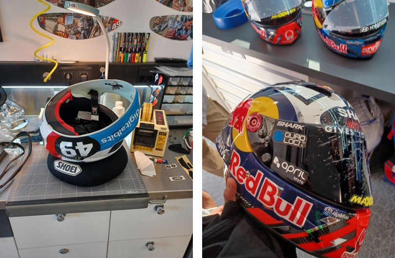 Première halte chez SHOEI où nous rencontrons le sympathique Mika qui s’occupe de la préparation des casques des pilotes. La présence d’un artiste sur place est l’occasion d’échanger sur la réalisation des décorations spéciales, peintes à la main directement sur le casque. On nous dévoile même en avant-première le design du casque de Fabio Di Giannantonio pour son GP national ! C’est avec de nombreuses informations et anecdotes en tête que nous poursuivons notre tour chez SHARK où nous détaillons le casque de Johann Zarco qui ne sera plus reporté après sa chute en Catalogne car trop endommagé.