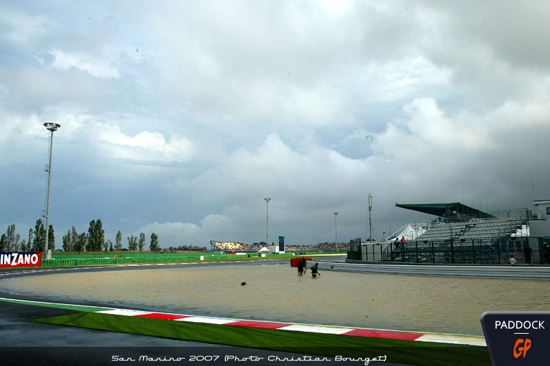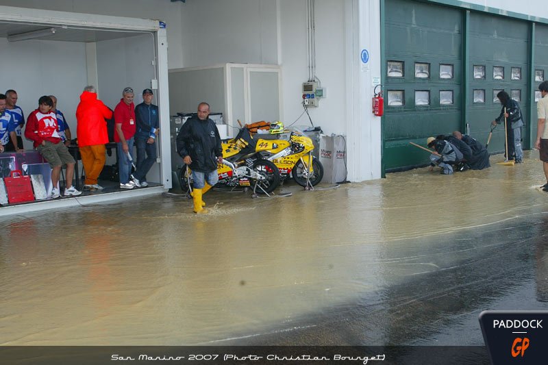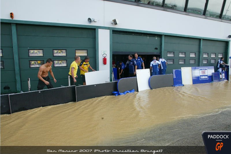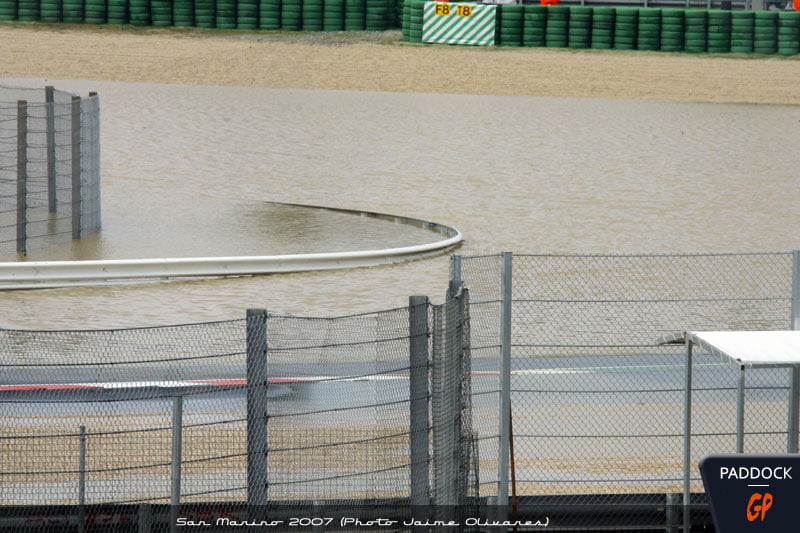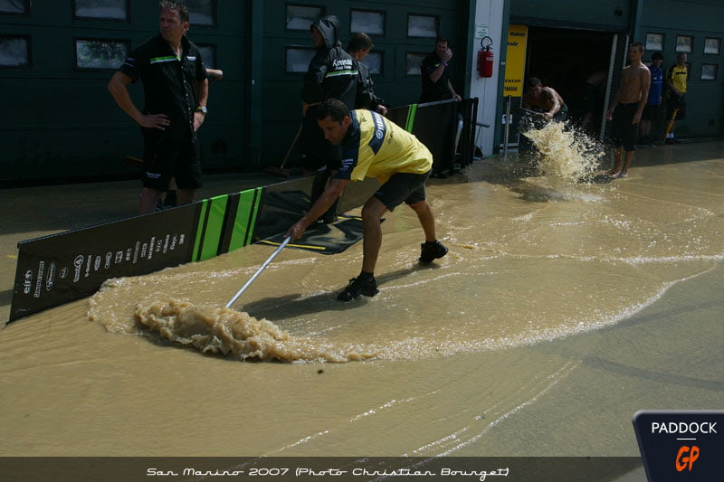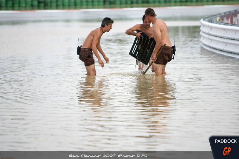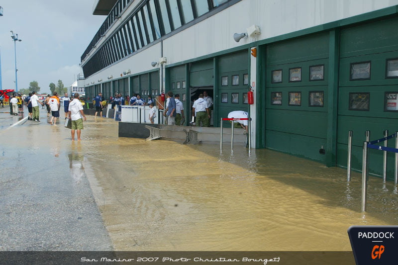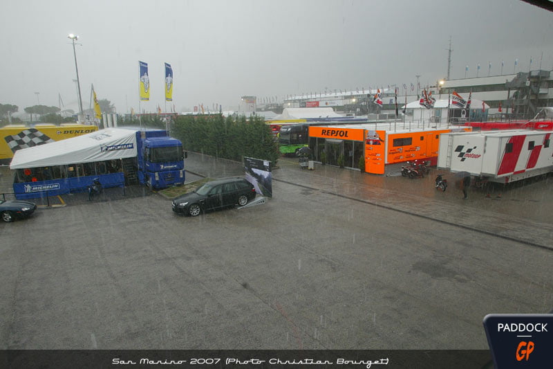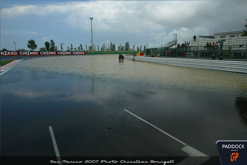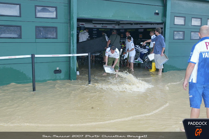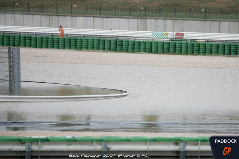 Au Misano World Circuit Marco Simoncelli, on a tout connu, d’un ciel immaculé au plus violent des orages. Évidemment, si on apprécie davantage le premier, ce sont les derniers qui marquent le plus, à commencer par l’édition 2007 et son inondation aussi soudaine que complète de la piste et des box (voir la galerie ci-dessous), mais aussi le Grand Prix 2017 et son triste record de 140 chutes, dont 80 pour le seul dimanche, avec 54 lors des courses !
