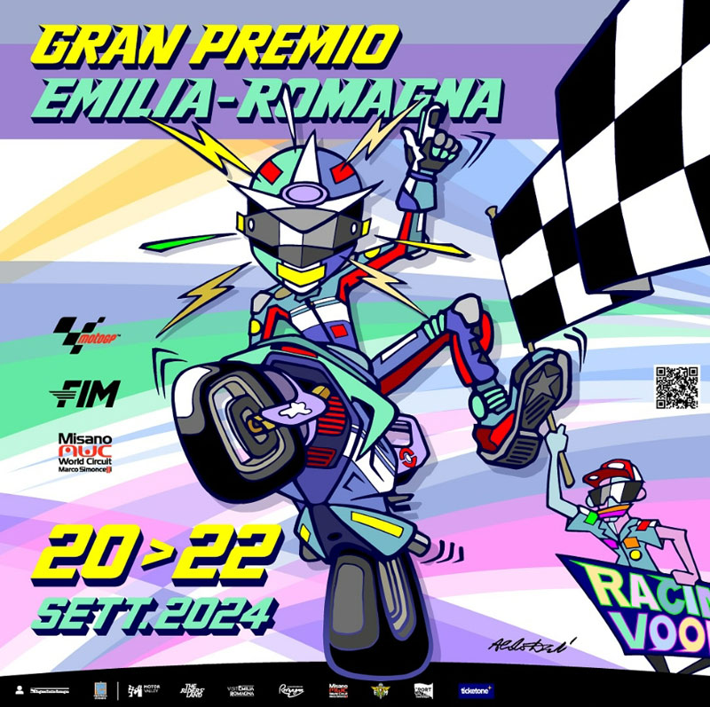 Pour le deuxième Grand Prix, celui d’Émilie-Romagne, l’affiche du graphiste italien cher à Valentino Rossi se démarque un peu de la ligne habituelle. Elle reprend l’imagerie de la grande fête mécanique prévue en 2022.