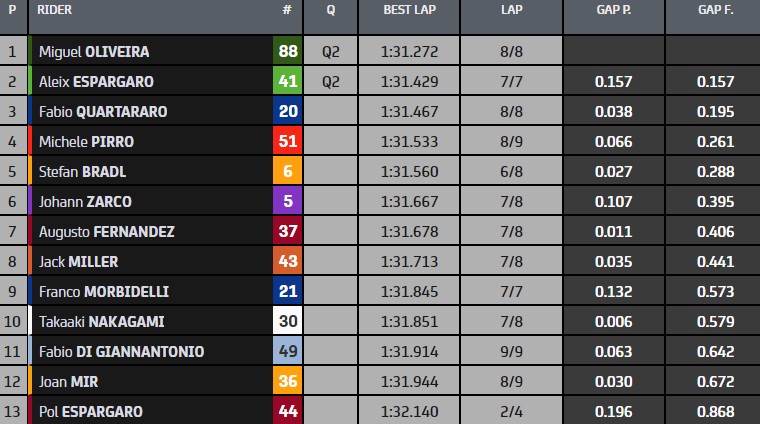Quartararo doit se contenter de la 13ème place, il partage la cinquième ligne de la grille avec Pirro et le Bradl. Zarco, Augusto Fernandez et un Miller décevant seront de la 16e à la 18e place en Sprint et Grand Prix. Derrière eux se trouvent Morbidelli, Nakagami et Di Giannantonio sur la septième ligne de la grille. Mir et Pol Espargaró partiront des 22e et 23e places, fermant le peloton.