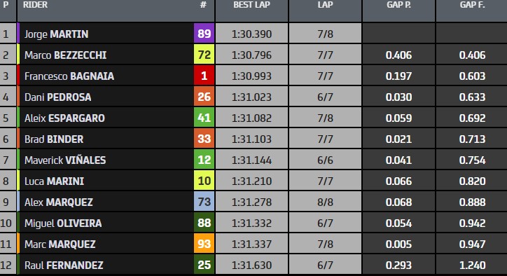 Jorge Martin claque un 1’30.390 il repousse son second Dani Pedrosa de plus de six dixièmes. Bezzecchi suit, mais Bagnaia dans un sursaut se place second. Au vu de son état, c’est un exploit.