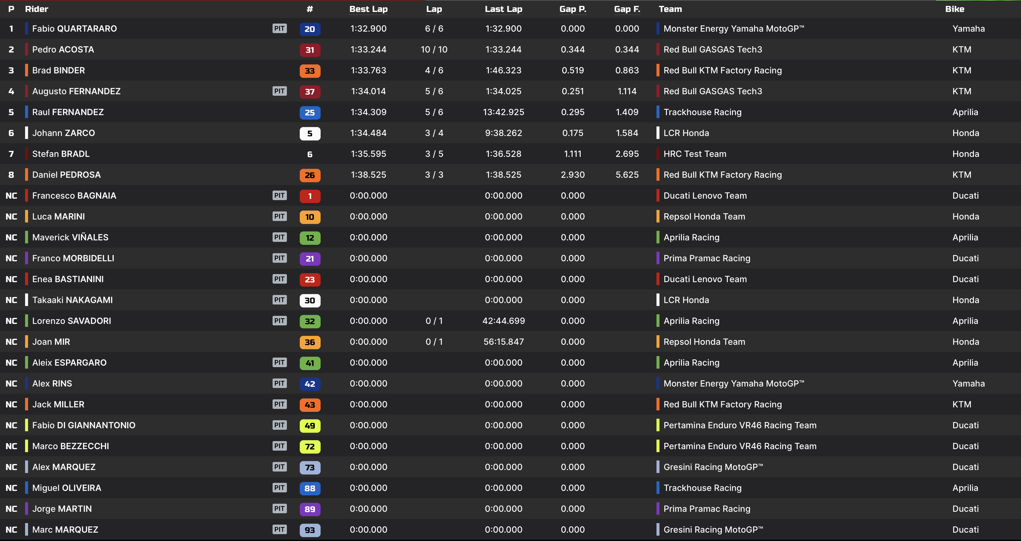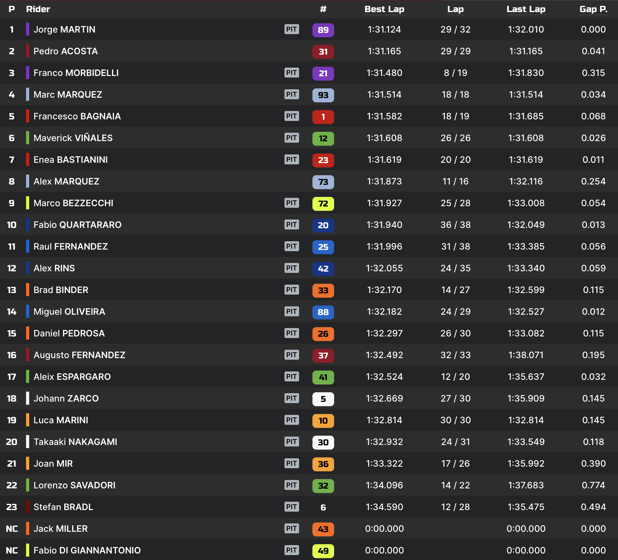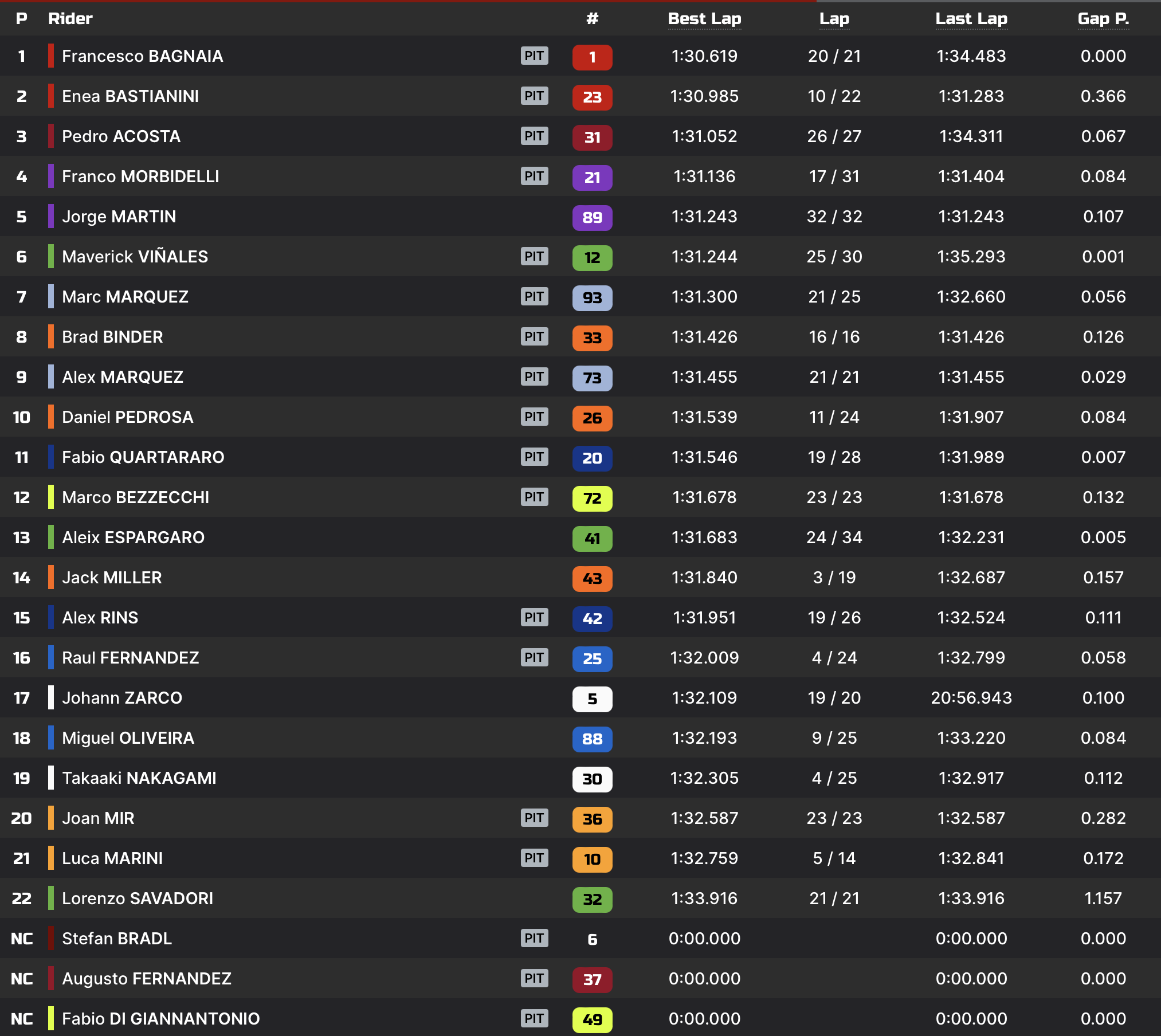 Pedro Acosta et Brad Binder ont encore beaucoup roulé, et comptent désormais respectivement 20 et 21 passages à leur actif. Les deux pilotes KTM évoluent toujours dans le top-3.